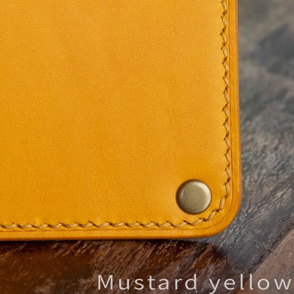 Mustard yellow, Olive green: A medium/firm leather with a very smooth surface that softens eventually to a buttery finish.