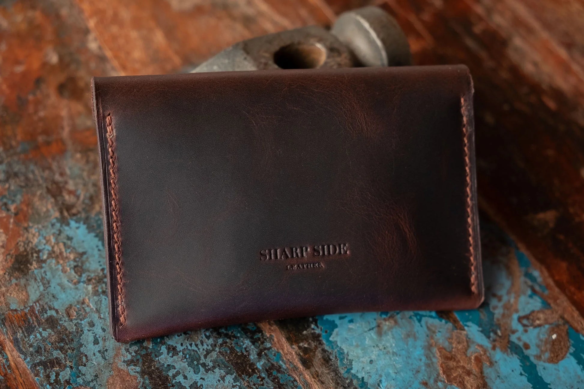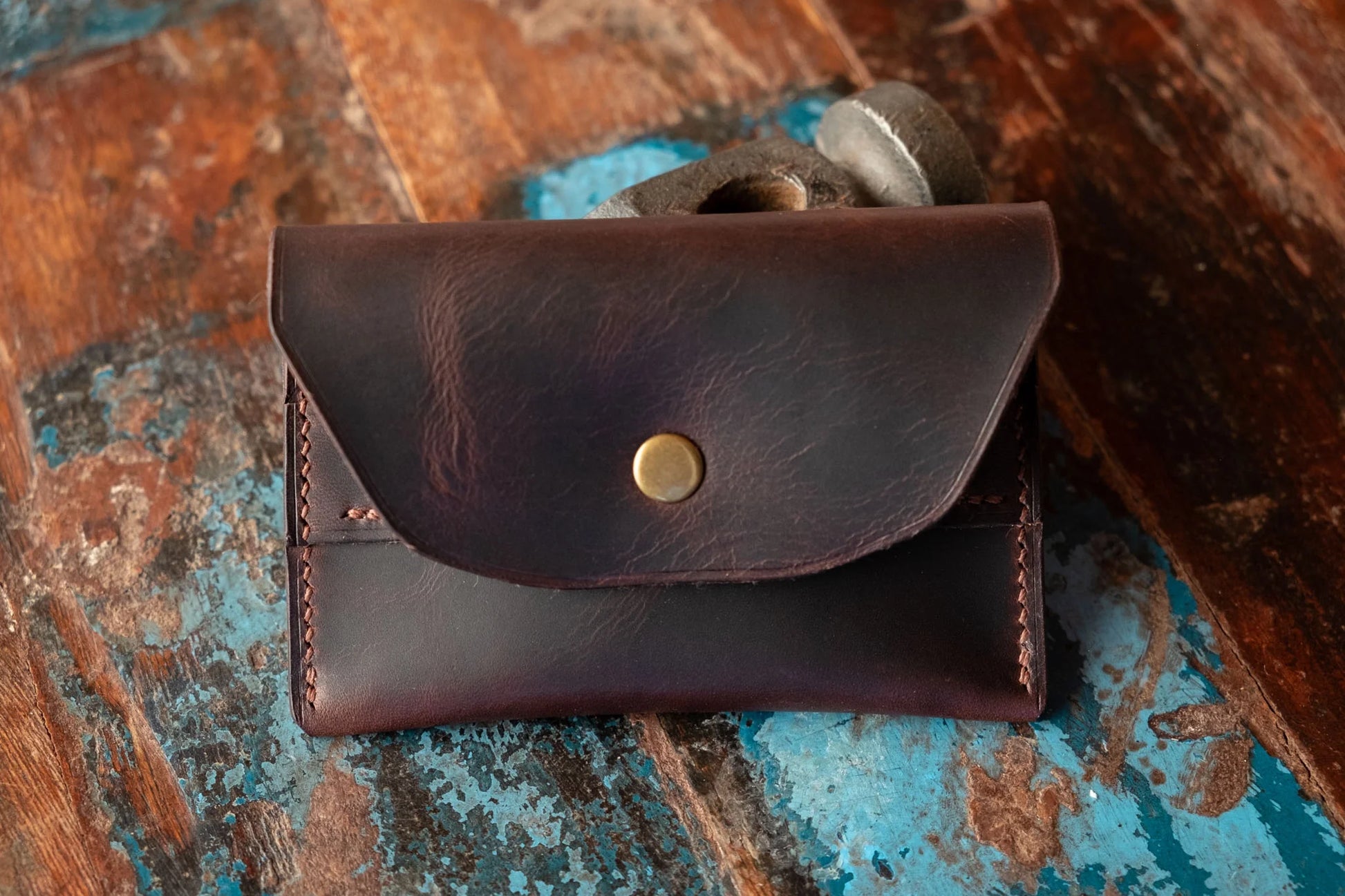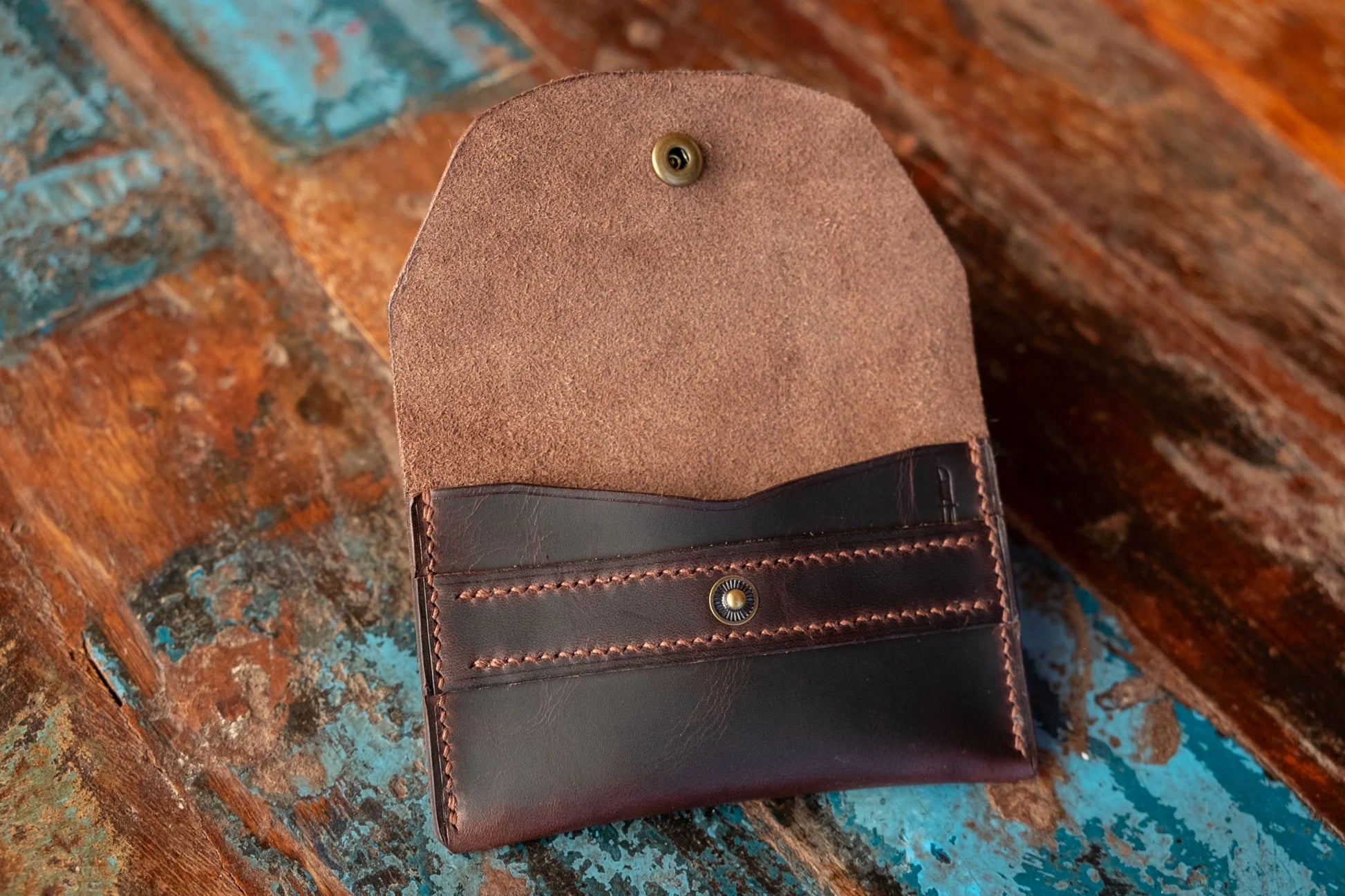 This Button Flap Wallet is made with dark brown leather, a classic color you can't go wrong with. It has a medium firmness with great texture and rich oils that show a nice pull-up when handled.