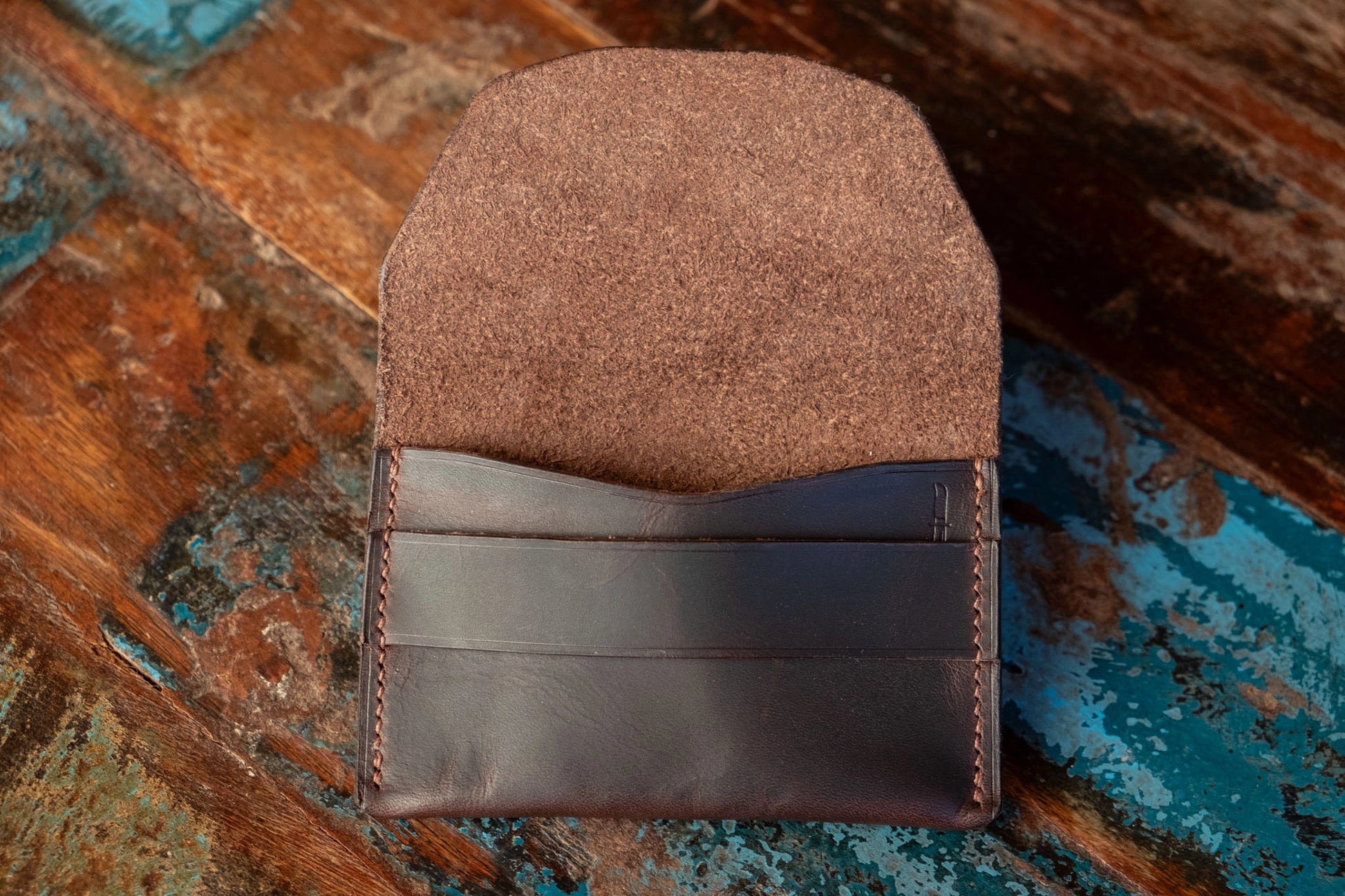 This Flap Wallet is made with dark brown leather, a classic color you can't go wrong with. It has medium firmness with great texture and rich oils that show a nice pull-up when handled.
