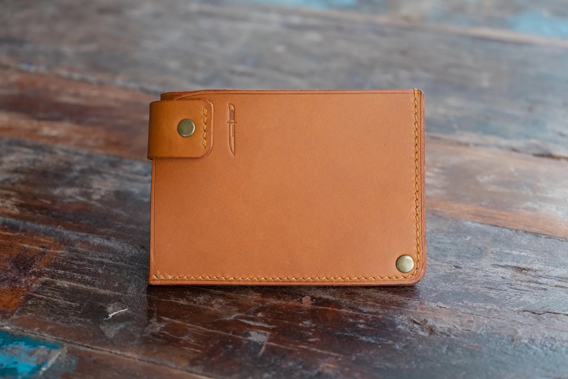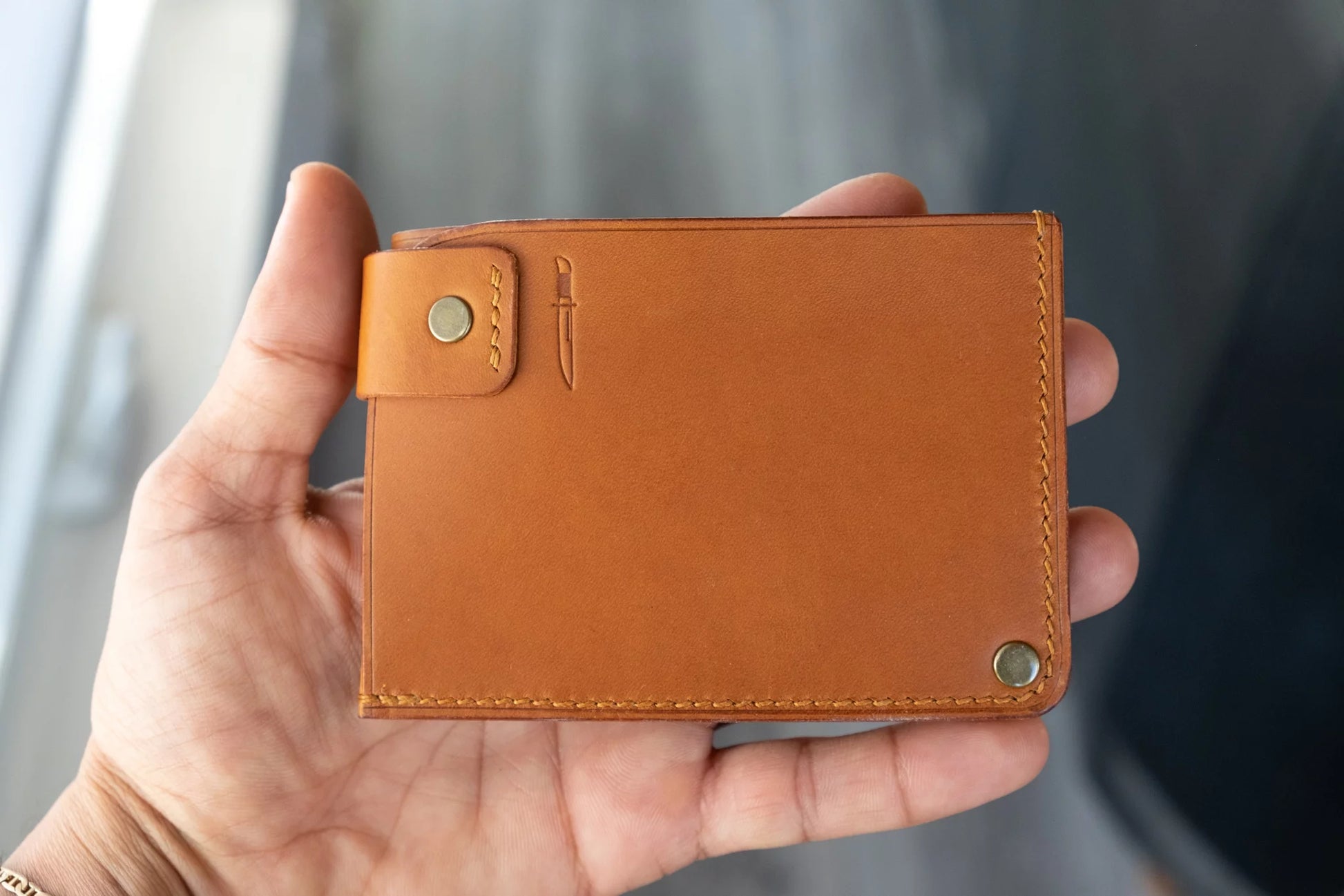 This Side Strap Pocket Wallet is made with a walnut brown leather. With a medium/soft firmness that is smooth to the touch, this brown wallet will develop a rich patina and age into a nice leathery brown.