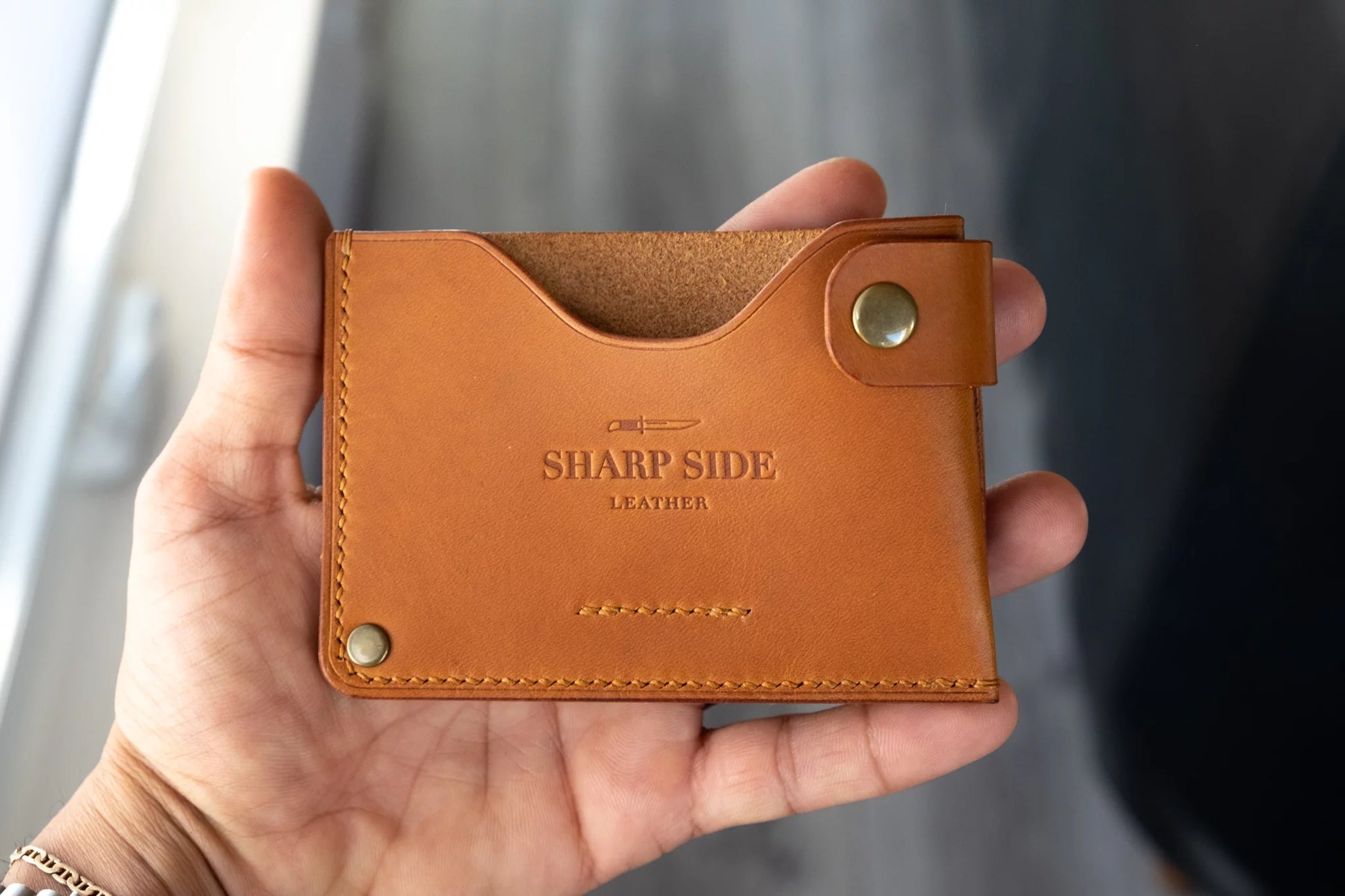 The Pocket Wallet carries your valuable cards in a neat stack with a little strap to keep it all snug, minimizing that clunky bulk. It will eventually form itself to your card stack, keeping them in place.