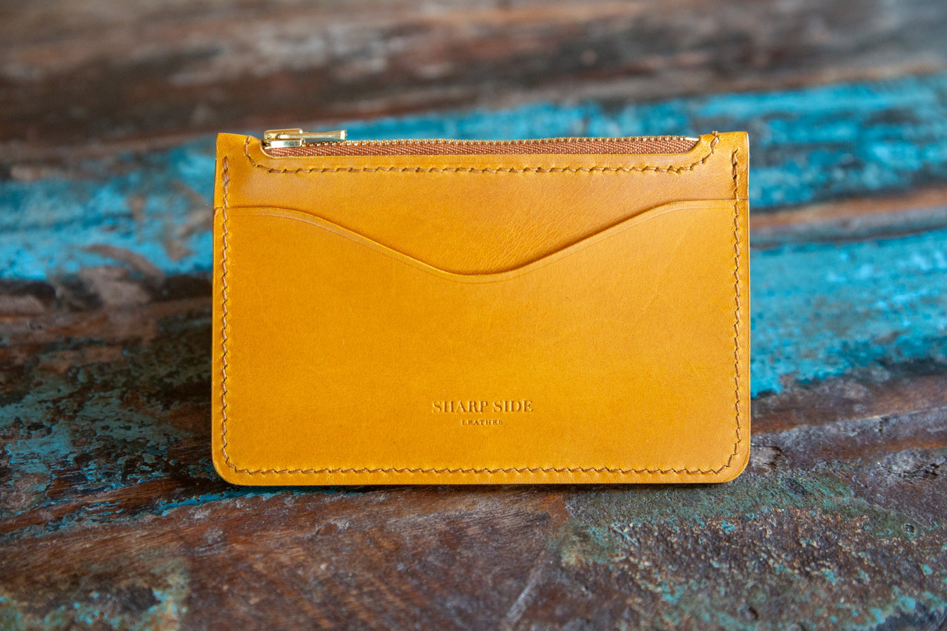 This Zip Wallet is made with mustard yellow leather and secured with a YKK brass zipper for that extra splash. This medium firm leather has a very smooth surface that ages to a buttery finish in a brownish yellow color.